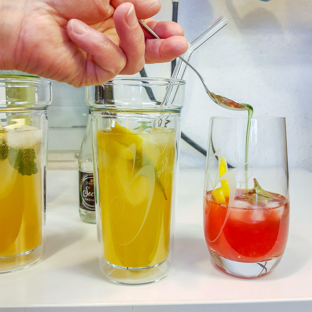- ausgepressten Zitronen- und Orangensaft und den Cranberrysaft in die beiden Gläser gleichmäßig verteilen.