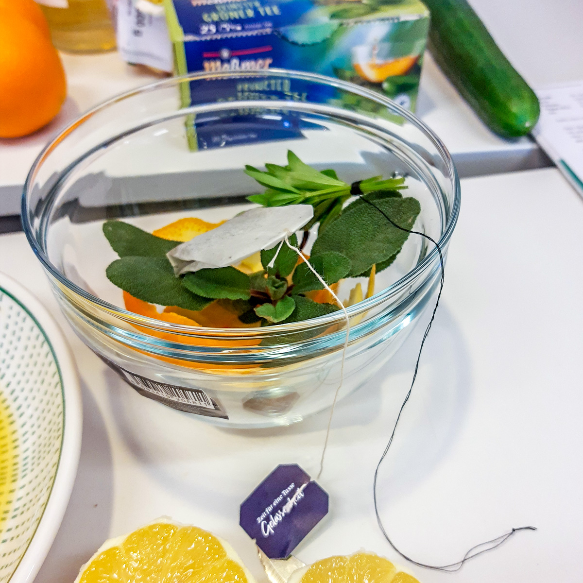 - Grünen Tee, Waldmeister, Schalen von Orange und Zitrone sowie Salbei zusammen mit 1 Tasse heißem Wasser circa 3 min ziehen lassen, dann über Nacht in den Kühlschrank