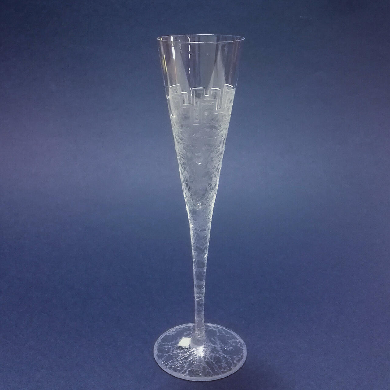 Klingt zwar ein wenig theatralisch, passt aber sehr gut. Denn der Eisblumendekor umhüllt fast das ganze Glas. Man nimmt es, und schon tastet man über diese angenehm prickelnde Struktur, die so gut zum kühlen Champagner darin passt. Stolz wird er gefasst von fürstlichem, am Graveurzeug von Hand geschnittenem Zinnenkranz und von ihm ehrenvoll kredenzt.