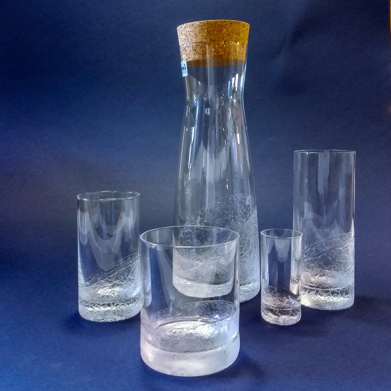 Die Kombination aus Karaffe und 2 oder 4 der Wasserbecher gefällt mir persönlich am besten. Wie ein Magnet wirkt hier die Anziehungskraft dieser prickelnden Eisblumenflächen, die Vorfreude machen auf ein erfrischendes Getränk. Nach genossener Labsal dann schickt die strenge Dynamik des Dekors die Runde mit frischem Schwung zurück ins weitere Tagwerk (…oder Stundwerk?).